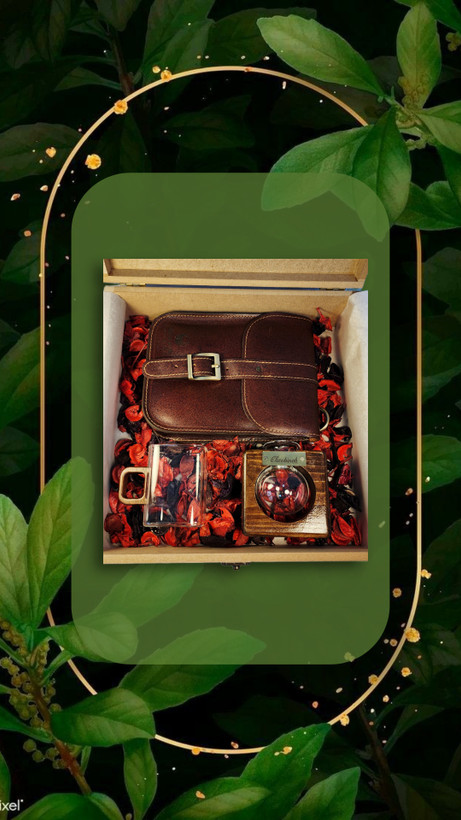 ست ترکیب کیف دوشی چرم طبیعی شتری با قابلیت تبدیل به کیف کمری. گلدان چوبی بلوری . لیوان پیرکس دسته چوبی. در جعبه منبت چوبی